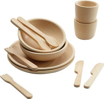 Your child can learn to properly set a table and enjoy pretend meals with friends and family with this wooden set that includes two place settings complete with utensils.