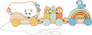 Colorfully painted wooden pieces will keep your little one entertained with this 15-piece train set designed with moving parts and a pull-along cord.