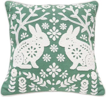 - This charming accent pillow showcases two white bunny stencil motifs paired with delicate botanical elements on a fresh green background, bringing the warmth and renewal of springtime into your home with rustic farmhouse appeal.