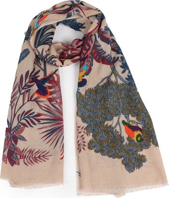 Embrace the warmth and beauty of nature with the Woodland Embroidered Wool Scarf in Vanilla. This exquisite scarf features a vivid print of colorful lorikeets perched among foliage, with rich reds, golds, and deep greens capturing the essence of autumn. The design blends exotic charm with woodland comfort, making it a statement accessory for the season. Crafted from soft, breathable wool, the scarf offers lightweight warmth and a comfortable drape, perfect for crisp fall days or cozy evenings by the fire. Generously sized, it allows for versatile styling—wear it as a wrap, layered over jackets, or draped elegantly around the neck to instantly elevate any outfit. With intricate embroidered detailing enhancing the vibrant print, the Woodland Embroidered Wool Scarf adds texture, color, and a touch of nature-inspired sophistication to your wardrobe. An essential seasonal accessory, it effortlessly pairs with sweaters, coats, and layered looks, making every ensemble feel thoughtfully styled and warmly inviting. Key Features: Soft, breathable wool for all-day comfort Vibrant parakeet and foliage print with embroidered