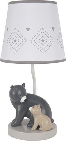 Add a soft glow to your child’s room with this custom mommy and baby bear lamp. This 3-dimensional hand-painted resin lamp with shade is approximately 14” in total height. The lamp shade has a dotted style diamond shaped design on a white ground with gray trim. Included is an energy efficient light bult equivalent to 60 watts and it uses less energy.