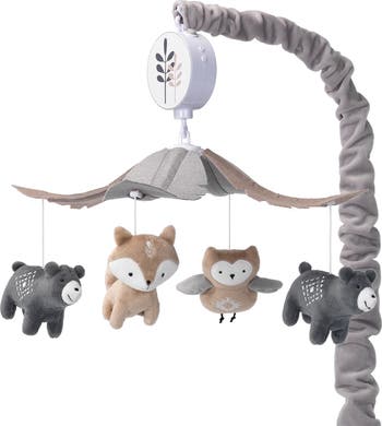 Two soft furry charcoal gray bears with white diamond embroidery, one minky tan colored fox with an embroidered tail and one little wise owl with a minky body with gray wings and an embroidered tummy circle around this charming musical mobile. A canopy of four leaves add to the charm. The gray velour scrunchie covers the mobile arm and the music box sticker has two tree branches. This battery operated musical mobile plays nursery songs for 20 minutes, has an on/off switch and volume control. It plays Brahms Lullaby, Twinkle Twinkle Little Star and Rock a Bye Baby. Requires 3 AAA batteries not included.