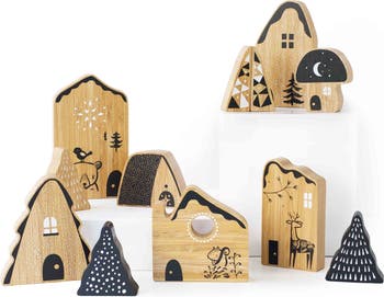 - 12-piece illustrated block set with houses, trees, and woodland details