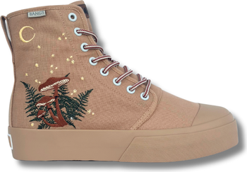 This stunning shoe is a fully embroidered design created in collaboration with Hannah Drapinski. The sole is 1.5 inches (our normal shoes have 0.9 inch soles) and the high top part around your ankle is ~ 1 inch higher than our normal high tops. This canvas is our Zion Sand khaki color.