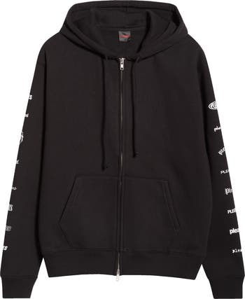 Different iterations of the label's logo ladder up the sleeves of this zip-up hoodie made from soft cotton-blend fleece for warmth and softness that will make it an instant favorite.