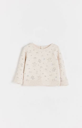 Printed sweatshirt in soft fleece. Matching plain ribbed cuffs and waistband. Snap-fastening pocket on the back. Embroidered logo detail on the sleeve.