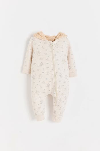 Baby romper made of soft fleece and lined with lambskin. This style is long-legged, long-sleeved, and hooded, with a full-length zipper. Thanks to its shape and quality, it is comfortable, practical, and adorable for baby.
