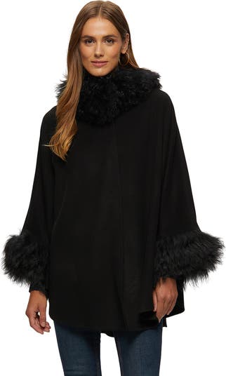 This cape blends wool and cashmere for exceptional softness, accented with a plush lamb trim to elevate warmth and timeless style.