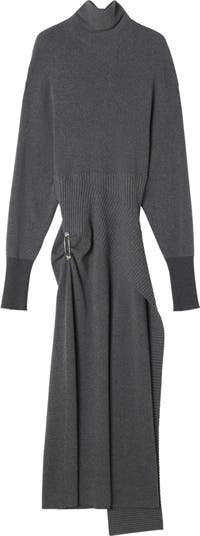 This dress is crafted from a blend of wool and cashmere. The fabric is soft, lightweight, and warm, and features draping reminiscent of some dresses found in the Maison's archives. The brooch adorning this piece adds an elegant, modern touch to a casual outfit.
