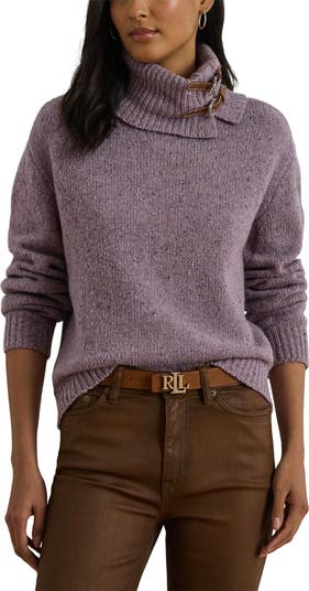 A pair of equestrian-inspired buckles accents the chunky turtleneck of this tweedy sweater knit from a warm wool blend.