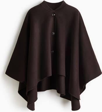 Oversized cape jacket in soft, woven fabric made from a wool blend. It features a small stand collar and buttons down the front.