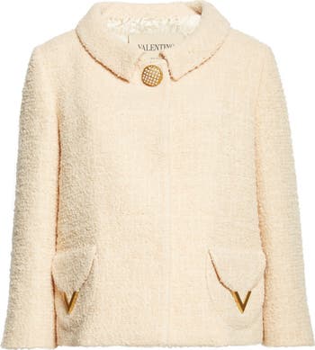 Alessandro Michele curtails his maximalist tendencies in this prim and proper jacket fashioned from wool-rich Italian tweed with a tonal jacquard lining and VLOGO medallions that subtly subvert the style’s restraint.