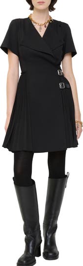 A short-sleeved wrap dress in a wool blend, with a pleated skirt inspired by kilts. The crew-neck silhouette is tailored to a slim fit and can be adjusted with the calf leather B buckle straps.||Side B buckle and button closure