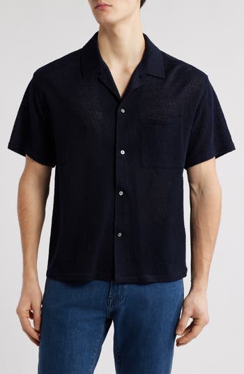 High-contrast buttons punctuate the front of this short-sleeve button-up crafted from wool-forward fabric.
