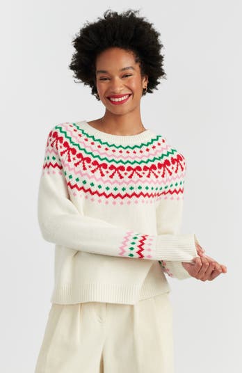 Festive, fun, and forever soft — this classic Christmas sweater is knitted from a luxurious wool and cashmere blend. The classic cream base is framed by a traditional Fair Isle yoke in red, green, and pink for a cheerful pop of color.