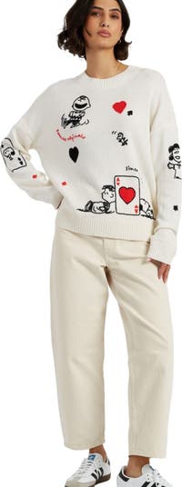 A standout piece from the Autumn Peanuts '25 collection, this grey chunky-knit sweater brings joy and nostalgia in equal measure. Spun from a sumptuous wool and cashmere blend, the relaxed silhouette is decorated with playful all-over intarsia featuring Charlie Brown, Snoopy, and friends mid-poker night. With tactile card suit motifs and “Peanuts Originals” stitched in signature red, it's an uplifting cold-weather knit with character and charm.