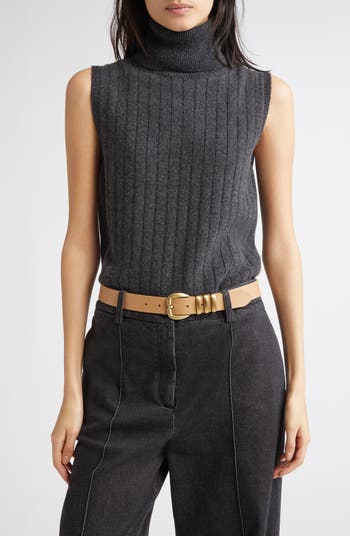 A tactile triumph, this sweater-vest draws attention with its drop-needle rib-knit design, adding architectural texture to a classic silhouette. Knit from wool blended with cashmere, the high turtleneck ensures a luxurious yet modern finish.