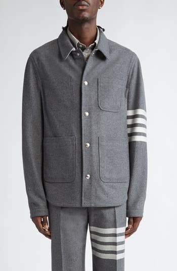 Thom Browne's varsity-stripe grosgrain tab adds a heritage signature to a utility-style jacket crafted from a rich wool blend lightly kissed with cashmere.