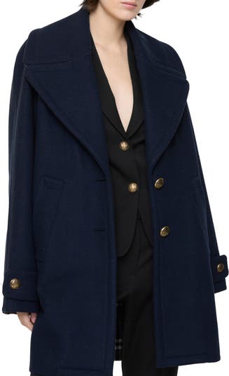 A single-breasted coat made in Italy from double-faced wool twill, opening to the Burberry Check in tonal pilot blue. The domed buttons have an antique finish and feature our B crest flanked by a pair of unicorns – inspired by an archive emblem found on Thomas Burberry’s personal silverware. Cut to an oversized cocoon silhouette with exaggerated lapels.||Single-breasted button closure|Side welt pockets|Button-tab cuffs|Burberry Check inner and undercollar|Comes with a garment bag