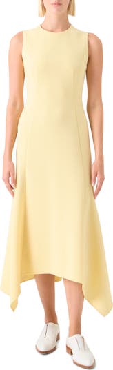 Presented in a pale, lemony hue, this textured wool crepe dress is expertly engineered as a sheath on top, transitioning to a gently flared midi skirt with a side-dipping hemline.