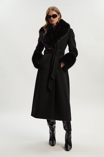 This striking belted coat from Karen Millen embodies sophisticated glamour with its sumptuous wool blend fabric and dramatic faux fur detailing. The tailored fit creates a feminine silhouette, while the detachable fur elements allow you to customise your look according to the occasion or weather. Style with knee-high boots as shown for an effortlessly chic daytime ensemble, or pair with slim-fit trousers and ankle boots for family gatherings.