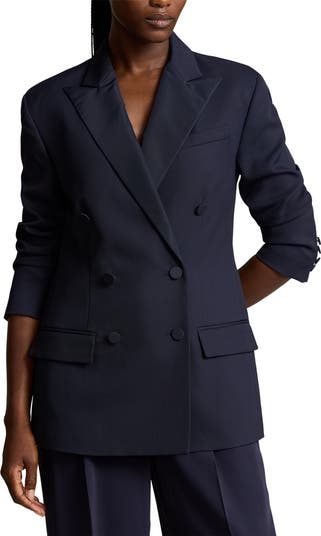 Covered buttons polish a double-breasted jacket cut with strong shoulders from pure wool and lined with soft silk.