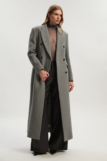 Double-breasted design with classic notched lapels for a sophisticated silhouette. Maxi length offering dramatic coverage and elegant drape. Tailored fit with structured shoulders creating a refined outline. Functional flap pockets add practical detail to this timeless piece. Wool blend fabric provides warmth and durability for everyday wear. This karen millen double-breasted maxi coat embodies effortless sophistication for the modern woman.