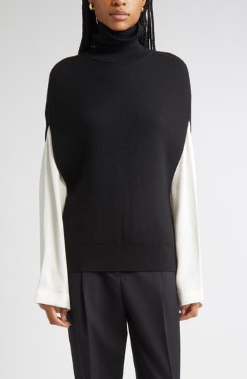 A dense Milano stitch in warming wool lends structure to this turtleneck vest knit with a split back and molded shoulders that give it a cape-like effect.