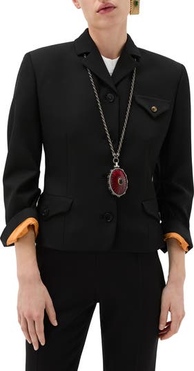 This single-breasted jacket in wool grain de poudre features draped sleeve detailing, a Medusa pin on the chest flap pocket and a contrast-colored lining that pops when the cuffs are rolled.