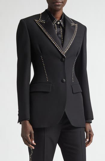 The sculpted shape of this striking wool grain de poudre jacket is emphasized by a diagonal line of domed studs along the waist darts. More silvertone and goldtone studs join up with bezel-set crystals along the sharp peaked lapels, while satin-covered buttons accent the placket and cuffs to make this an unforgettable piece.