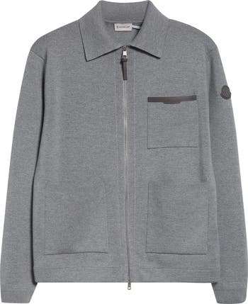 This virgin wool zip cardigan is knit in a firm Milano stitch for stretch retention and trimmed with genuine-leather trim at the zip pull, chest pocket and logo-debossed sleeve patch.