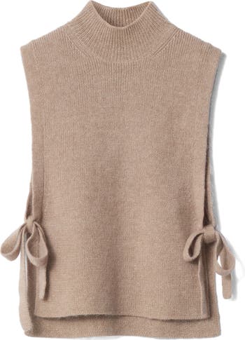 Front and back panels tie at the sides on this bib-style mock-neck vest knit from fuzzy wool and mohair yarn.