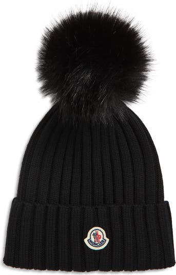 Stay warm on snowy slopes or city streets in this ribbed beanie made from soft wool and topped with a plush faux-fur pompom.