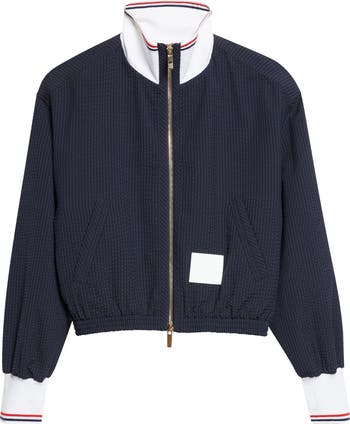 Cut from extrafine wool seersucker, this zip-up track jacket blends crisp suiting cues with athletic inspiration. Lightweight and breathable, the fabric is woven with the signature crinkle stripe that adds texture and movement while holding its shape. Tipping stripes pop at the collar and cuffs, while the brand's signature tricolor tab marks the back neck seam.