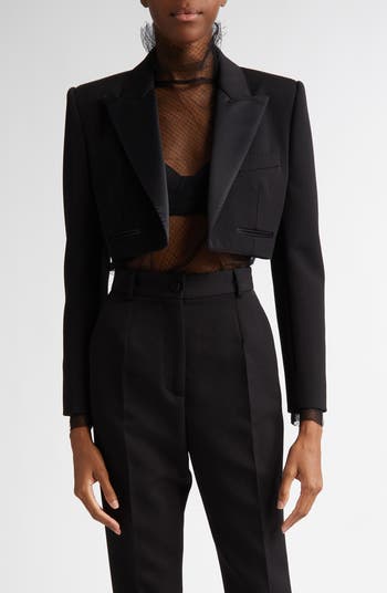 The subject is tuxedos for D&G's fall '24 collection, and this runway-featured cropped blazer is one variation on the iconic formwalwear, with peaked lapels traced in pickstitching dominating the look.