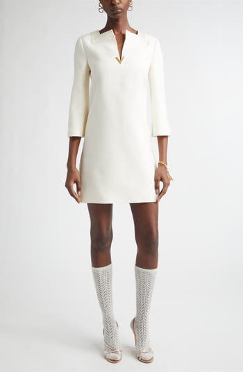 A gleaming VLOGO adorns the square split neckline of this wool-and-silk dress cut with abbreviated sleeves and a structured A-line skirt.