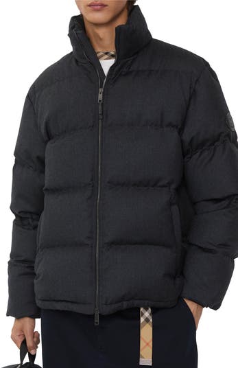 A puffer jacket made from lightweight wool flannel, filled with goose down and feathers. The style is lined in Burberry Check cotton in a truffle brown colourway and features an appliquéd leather Knight stamp – an archival motif first seen on Burberry bags in the 1980s. Cut to a relaxed fit with a packaway nylon hood for unpredictable weather.||Two-way zip closure|Packaway drawcord hood|Side zip pockets|Storm cuffs|Drawcord hem|Leather patch with Equestrian Knight Design at sleeve|Burberry Check lining|Comes with a garment bag