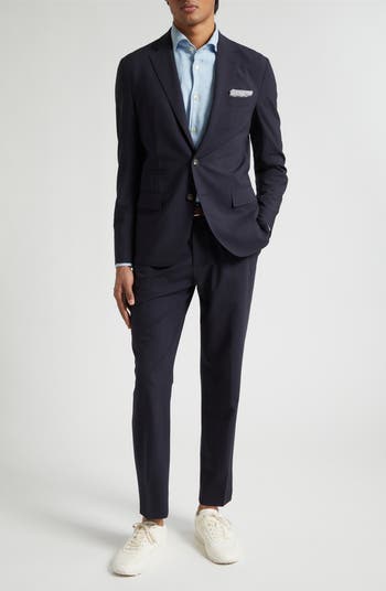 This Italian-made suit done in a single-breasted silhouette is tailored from stretch-kissed wool gabardine and finished with meticulous pickstitching for a bespoke look.