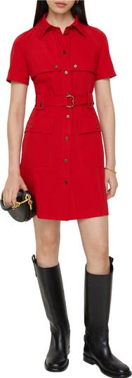 A short-sleeved dress crafted from wool twill in seasonal crayon red – created as part of our Year of the Horse capsule. Drawing inspiration from our heritage rainwear, the design's signature trench details include a gun flap and a storm shield at the back. The style features cargo pockets and is shaped to a straight fit with an adjustable B buckle belt in an antique brass finish.||Button closure|Point collar|B buckle belt|Side button flap pockets