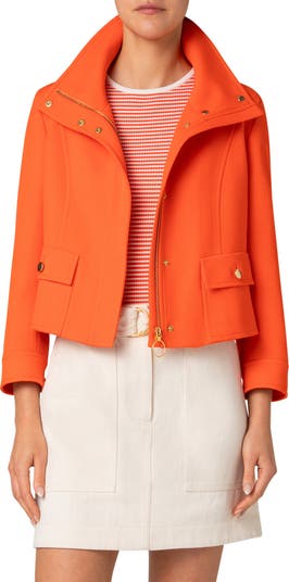 A vibrant orange hue—a favorite for the label this season—enlivens this cropped jacket crafted of signature wool tricotine and finished with polished gold buttons.