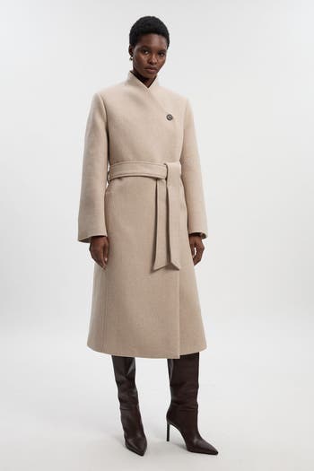 Wool Wrap Neck Tailored Belted Midi Coat