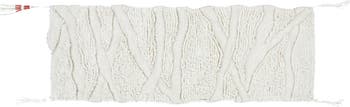Abstract patterns in mixed textures relax the look and feel of a rug made of washable wool that's woven with irregular borders and small, mismatched tassels.