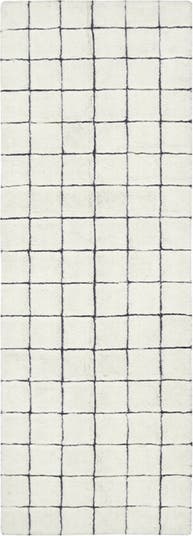A pattern inspired by vintage ceramic floors is created by the check pattern of this washable rug that allows hints of the contrasting base to show through.