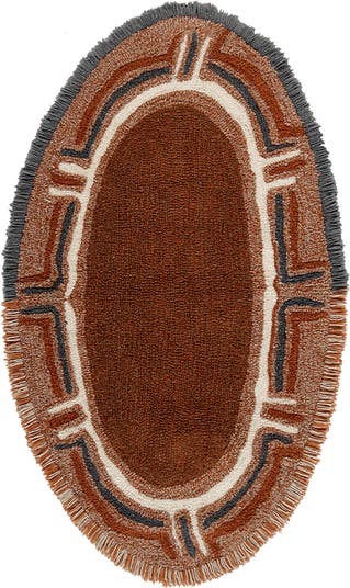 Oval shaped wool rug inspired by the entrance of a Maasai hut. The center of the rug is made in short pile mixing terracotta and oxide shades and surrounded by a border of tribal symbols in Seashell, Charcoal and Walnut shades. The rug is finished with a line of long pile in contrast colors at the very edge. A cotton tote bag and a non-slip underlay are included with every rug.