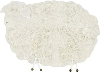 The Pink Nose Sheep rug is shaped as a fluffy sheep, and is a true artesan creature. Combining different heights of soft wool pile achieving the messy look of a sheeps fur, the rug has slightly rounded borders, showing the silhouette of the head and the ears. Handmade braids forms the legs of the sheep, which are attached loosely through a small opening in the rug and easily removable when washing the rug.