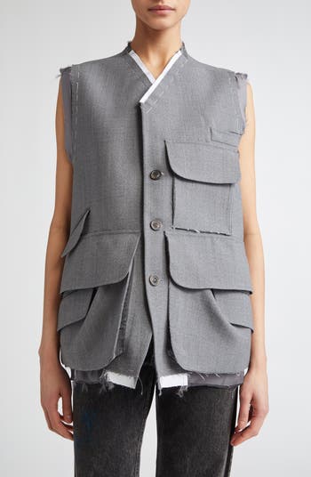 The subversive maison shows its handiwork handily in this chaotically pocketed cargo vest on its way to being tailored from Italian wool. The brand's signature four-stitch moniker is hidden in plain sight among rows of white basting stitches as the raw-edged lining shows through.