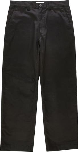 Relaxed straight fit five pocket chino work pant. Featuring slant pockets, coin pocket, with one button closure and one drop rear pockets, and embroidered vowels logo on rear right pocket. Reinforced along the hem and belt loops. Treated with cold mercerization process for a crisp glossy sheen.