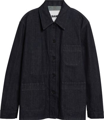 The German designer's signature minimalism shines through the clean lines and indigo-dyed dark wash of this denim chore jacket cut in a softly oversized silhouette.