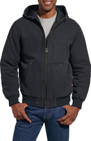 Combat the elements in this rugged everyday bomber designed with a protective hood.