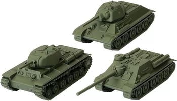 WORLD OF TANKS: MINIATURES GAME: U.S.S.R TANK PLATOON - WOT64 - This Expansion Contains: 3 Painted Plastic Tanks, 3 Tank Cards, and 15 Upgrade Cards (1x T-34 - Medium Tank, 1x KV-1S - Heavy Tank, 1x SU-100 - Tank Destroyer) Compete with friends in the ultimate tank battle tabletop simulation. T-34: Medium Tank - The T-34 tank was the cornerstone of Soviet armored forces in World War II. Other tanks may have been lighter, better armed, or had a bigger gun, but there is only one T-34! When first encountered by German forces, they were shocked by just how good it was and scrambled to find ways to deal with the revolutionary design. SU-100: Tank Destroyer - Combined with a fixed gun this means that the SU-100 has a lower initiative than many other tanks. The SU-100 has one of the highest Firepower stats of any tank, but suffers from low Initiative. Support it with a good crew and it will be deadly on the battlefield. Nicknamed ‘cat-killers’ the SU-100 was a dedicated tank killer designed to hunt German Panther and Tiger tanks. Their 100mm guns were more than capable of dropping those fearsome beasts. With an outstanding Firepower it is at its best when ambushing enemies. KV-1S: Heavy Tank - Developed as a replacement for earlier, slower, heavy tanks the KV-1S was fast enough to keep pace with supporting tanks on the battlefields of the Eastern Front. Heavy tanks are great damage soaks but can re-roll a blank defense dice. You can't ignore them because they can grind up the table and seize objectives or break up formations, but their ability to bounce enemy shells means you need to really concentrate your fire to knock them down. SUMMARY: The World of Tanks: Miniatures Game is an easy to learn, quick play, small scale tabletop game. You take command of a Tank Platoon, seeking to destroy your opponent’s tanks and secure victory.